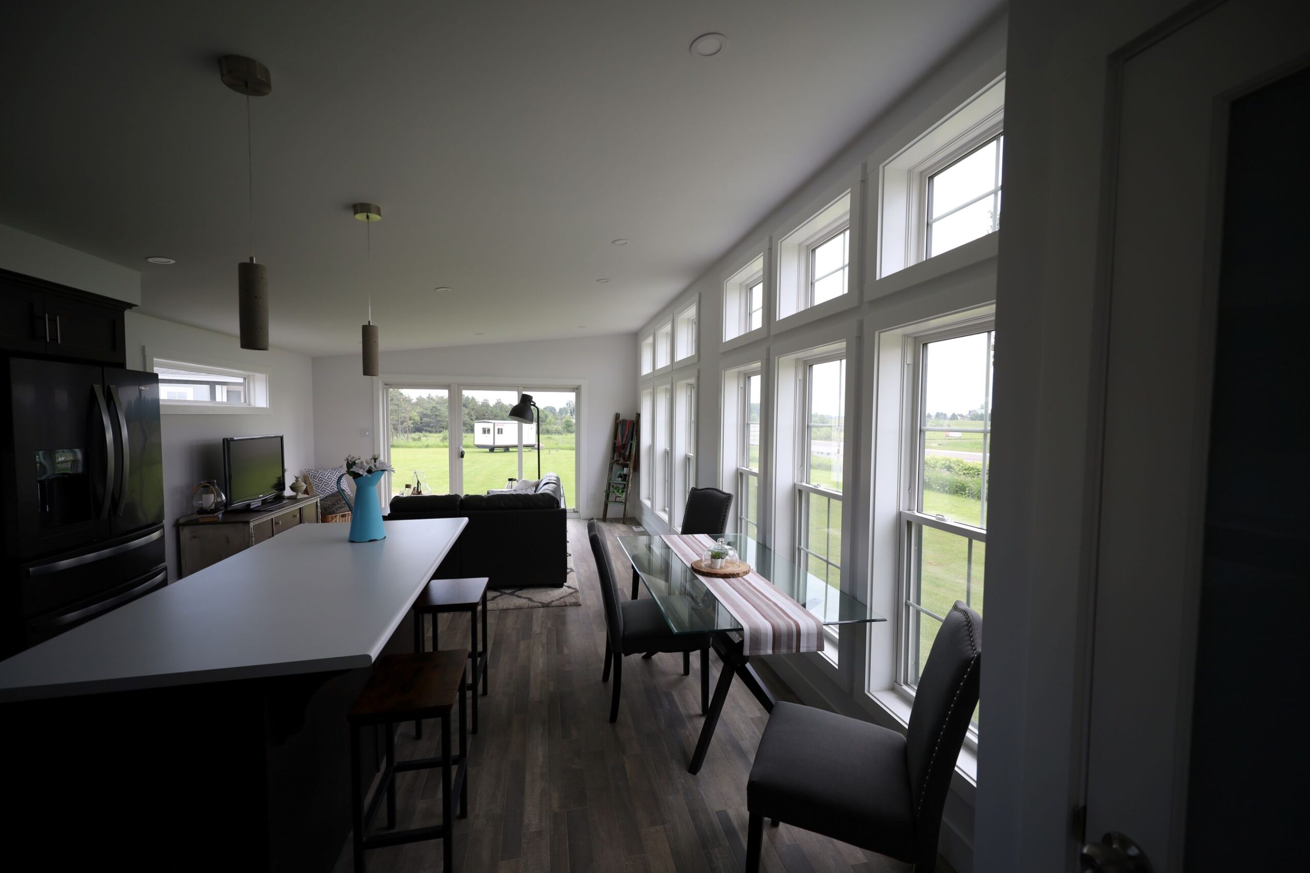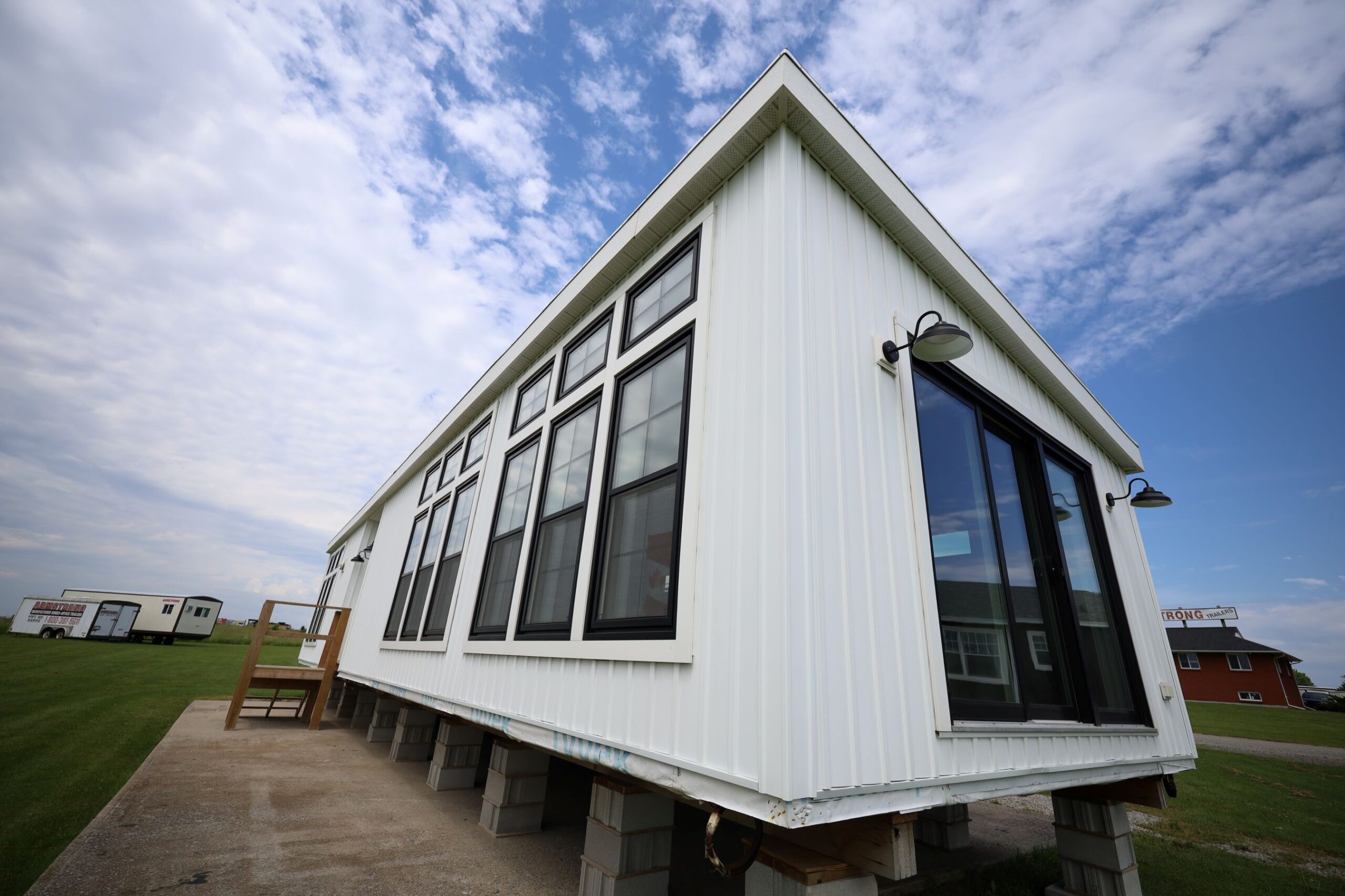 A brand new design with a wall of windows to look over your property or lakefront view. The distinctive shed roof give you a high ceiling interior with beautiful high end finishes. We have fitted out this home with wonderful features like the coat nook, tile shower, black stainless appliances, high transom windows, a large spacious kitchen with island, and a 9 foot patio door. This home will be perfect as a summer getaway or full time residence